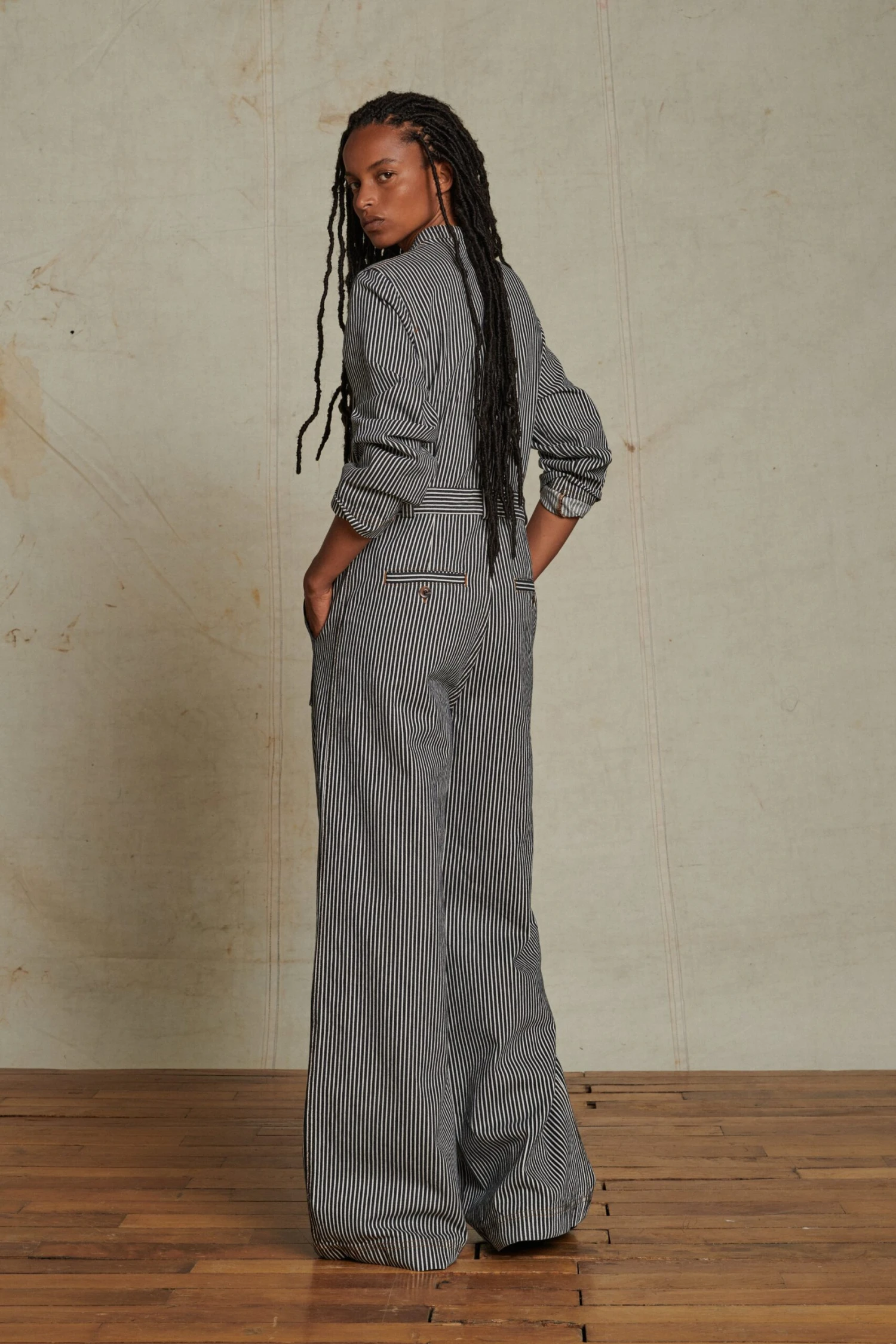 AKARI est une combinaison-pantalon en toile de denim épaisse. Sa taille haute ajustée contraste avec sa jambe large évasée, signant une silhouette 70s. Cette ligne rayée est signée de la griffe « Soeur Womenswear » qui ajoute à son allure workwear et décontractée.
