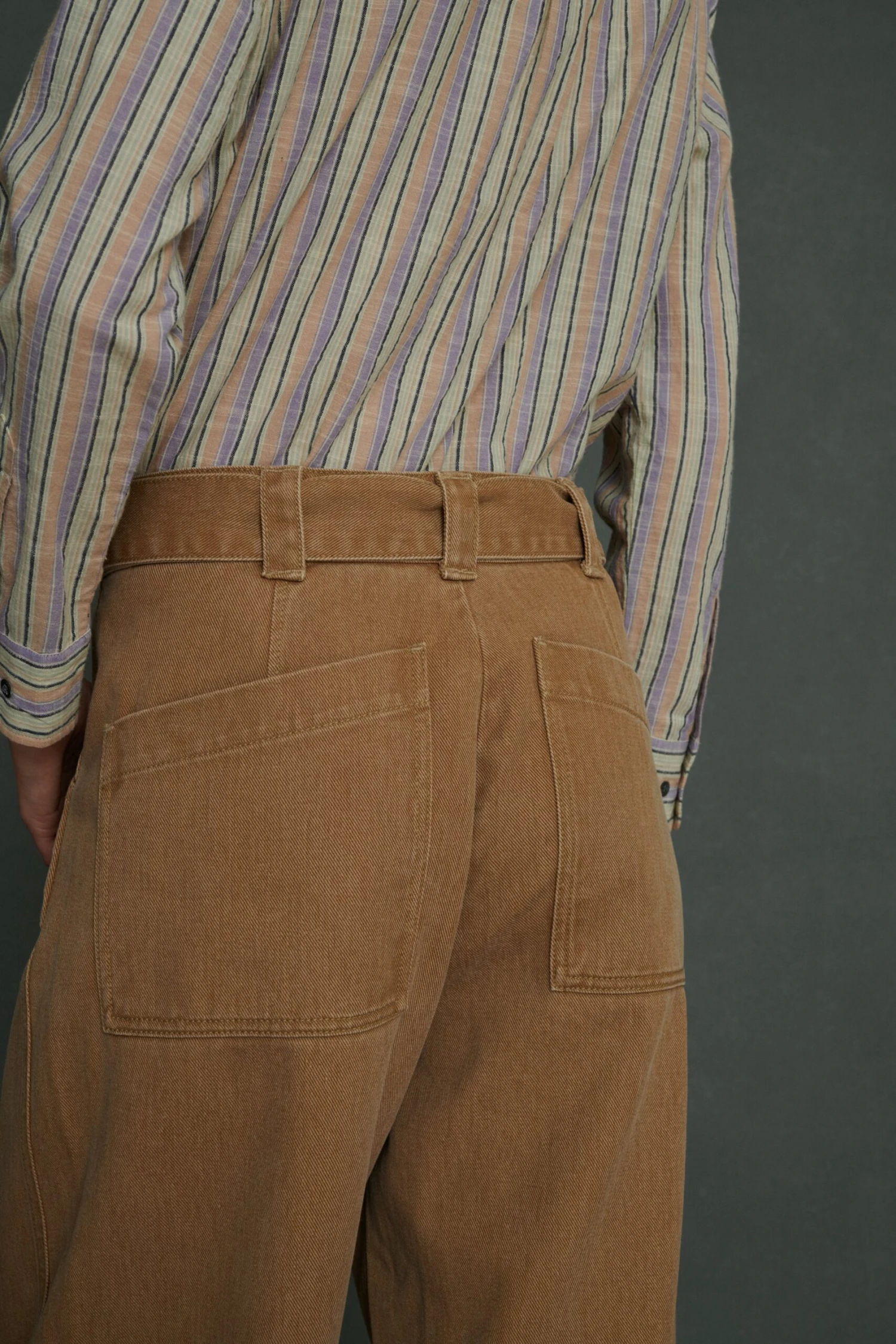 Pantalon taille haute ceinturé en denim souple beige