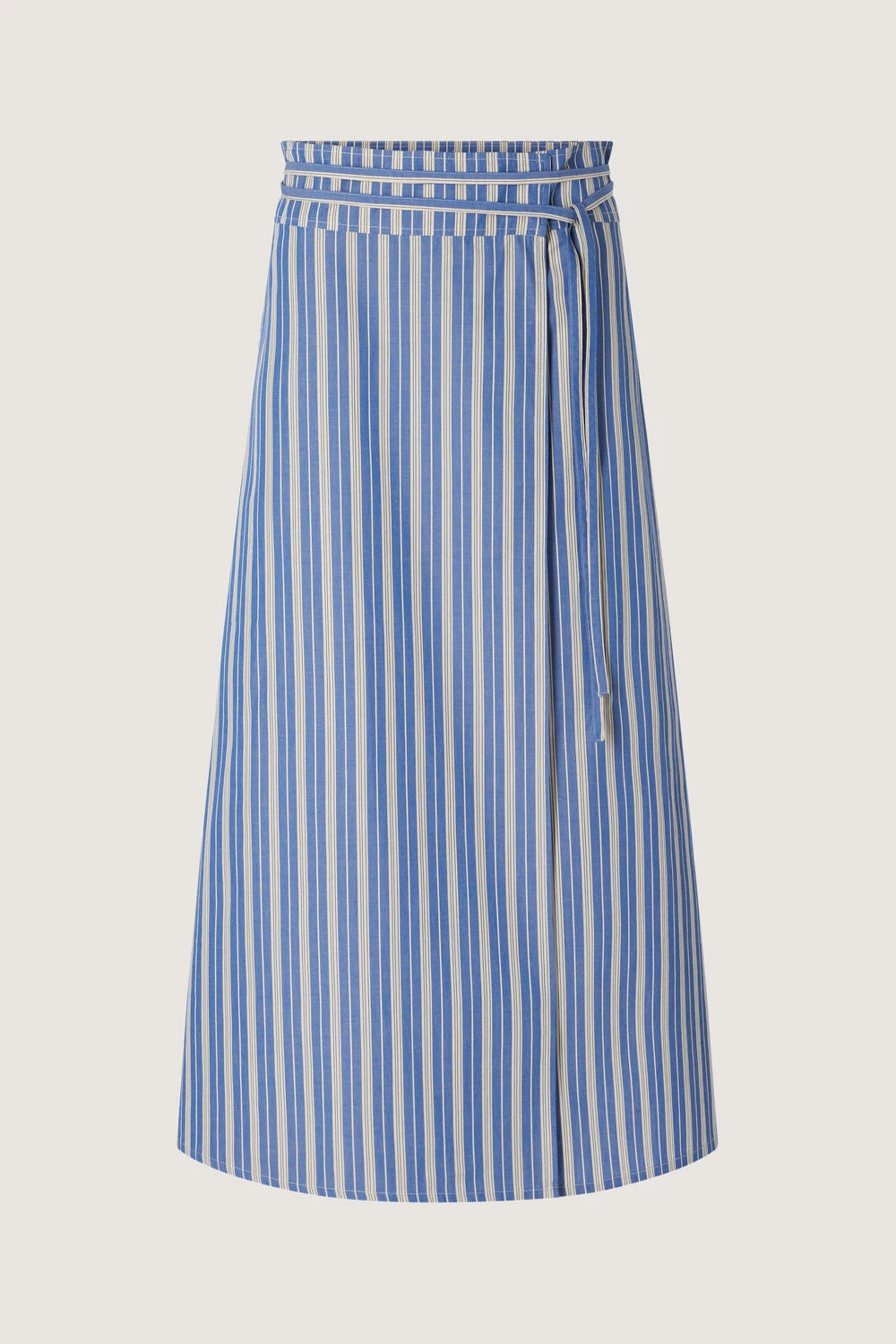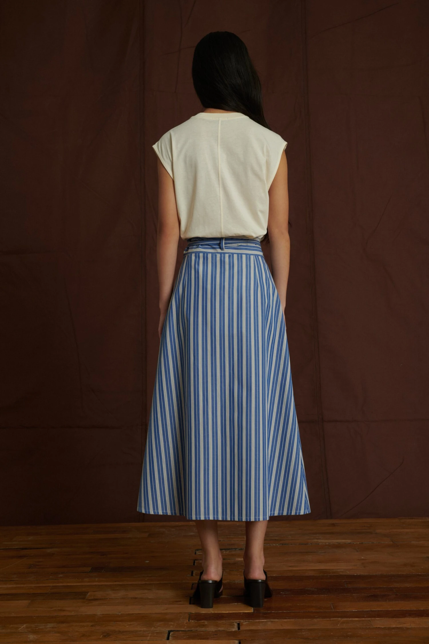 Jupe portefeuille mi-longue en popeline de coton souple à fines rayures bleues et blanches