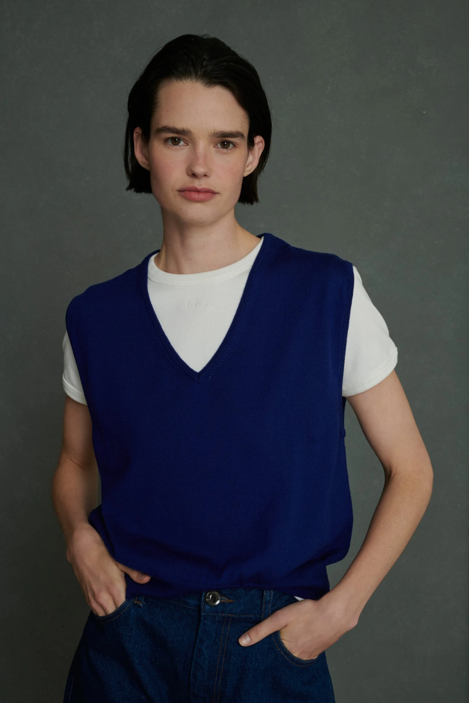 SONIA est un pull sans manches résolument oversize et à l’encolure V profonde. Tricoté dans une laine mérinos fine et douce, il se porte à même la peau ou en superposition. Finitions bord-côtes en bas de corps afin de pouvoir le faire blouser.