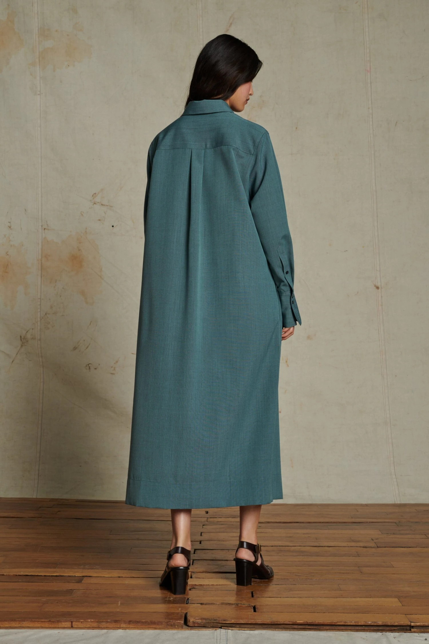 ARPEGE est une robe vert d’eau à porter ample et droite ou ceinturée pour marquer la taille. Le jeu de col est une signature du Studio. Ici, le surplus de tissu au devant crée un drapé modulable. Confectionnée dans une laine souple, le tissu mélange des fils de couleurs qui créent un effet changeant, presque irisé.