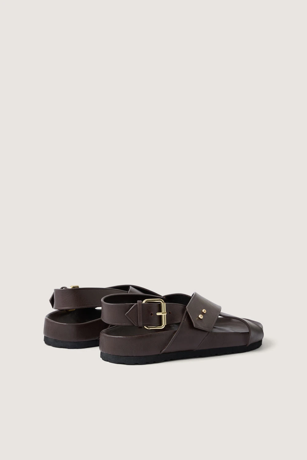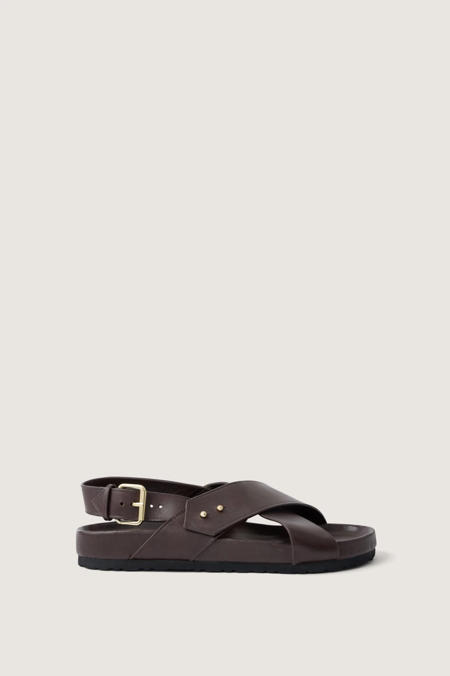 OLAF est une sandale en cuir. Sa semelle épaisse (en liège recouvert de cuir lisse) épouse la courbe du pieds pour pouvoir les porter avec confort toute la journée. Les brides croisées apportent de la tenue. Ce soulier taille une demi-pointure au-dessus pour pouvoir y glisser des chaussettes épaisses afin de traverser la saison.