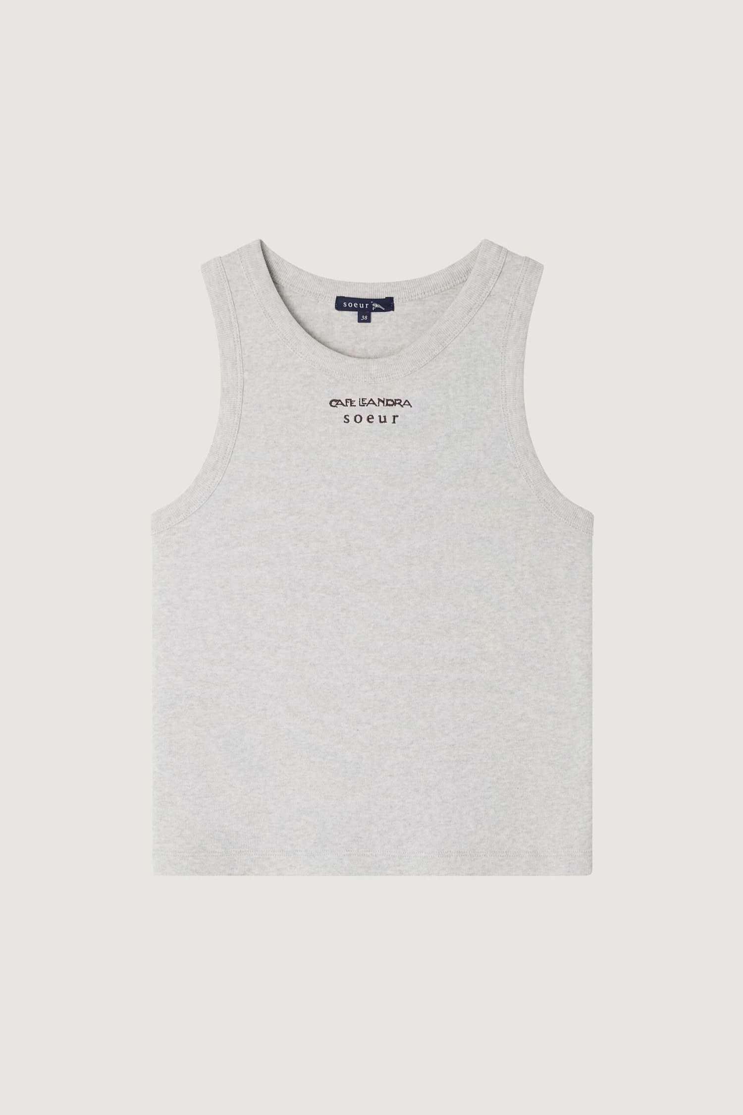 Débardeur « tank top » en coton biologique gris chiné, broderie CAFÉ LEANDRA & SOEUR.
