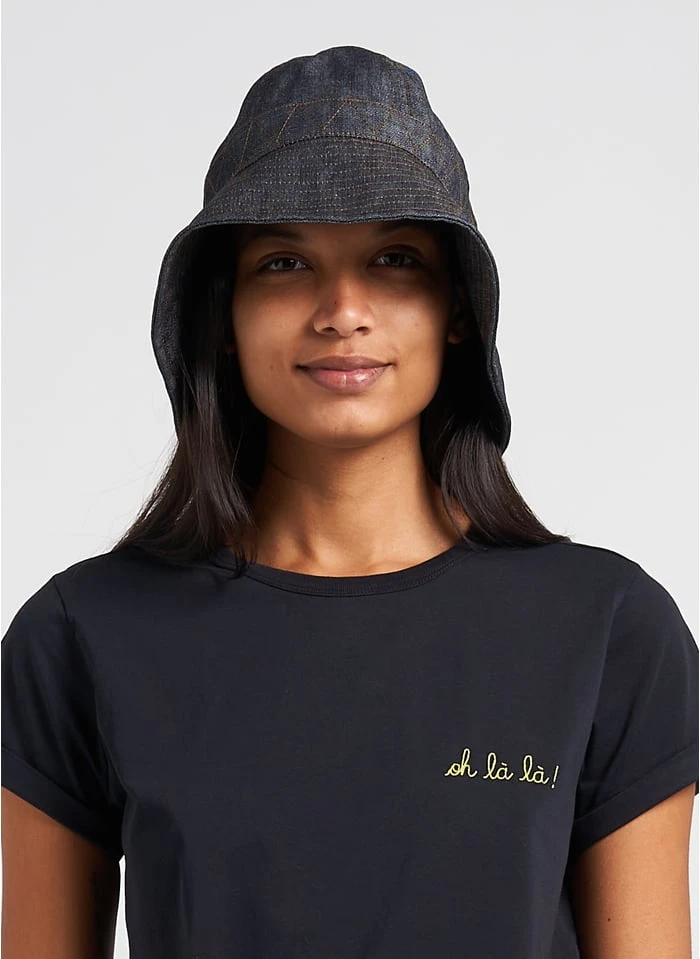 Ce modèle est présenté avec Tee-shirt col rond brodé oh là là en coton bio by MAISON LABICHE