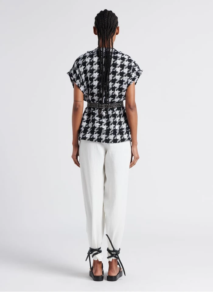 Ce modèle est présenté avec Veste col rond en coton mélangé by IRO, Sandales compensées en cuir by V DE VINSTER, Ceinture cloutée en cuir by BERENICE