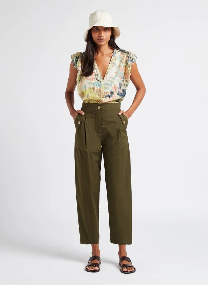 Ce modèle est présenté avec Robe longue col classique imprimée en soie by MOMONI, Chapeau en coton et li by SOEUR